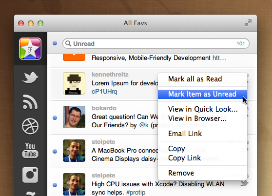 Once you selected an article it will be marked as unread. From the context menu it is possible to change the read state back to unread and also to Mark all as Read.